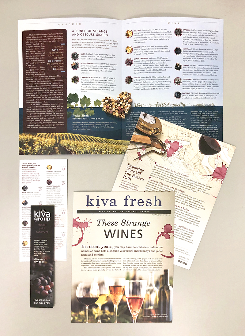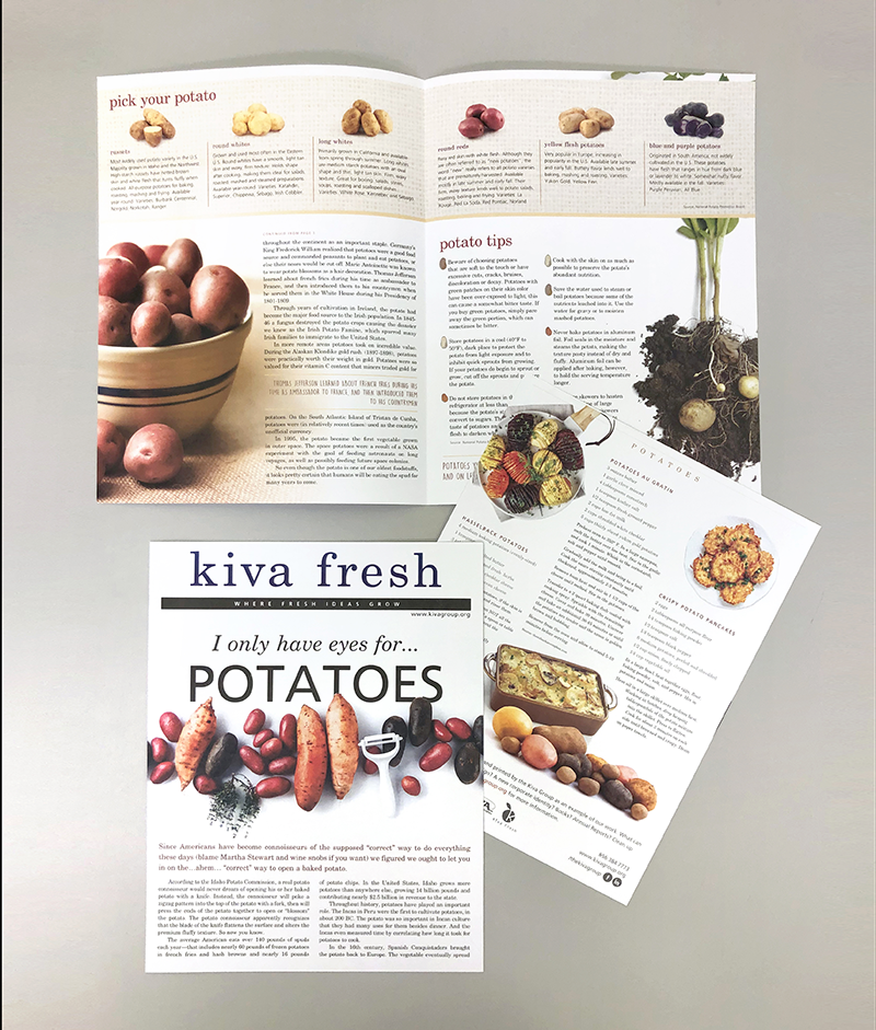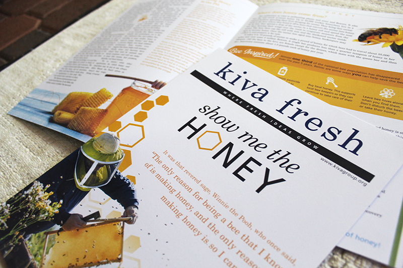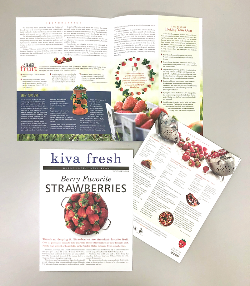 Kiva Fresh is the marketing and design arm of The Kiva Group. The idea is to provide a fresh and organic approach to the design process. To illustrate this, I designed monthly newsletters focusing on farm fresh and fun foods for their client base. It showed off their design and printing capabilities. These were mailed out with inserts focusing on different ideas and specials Kiva Fresh was offering.