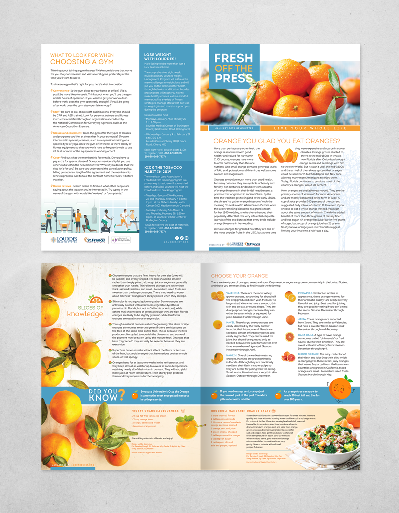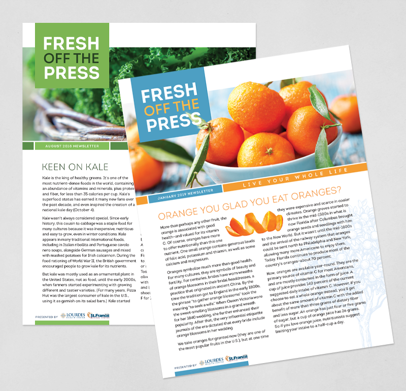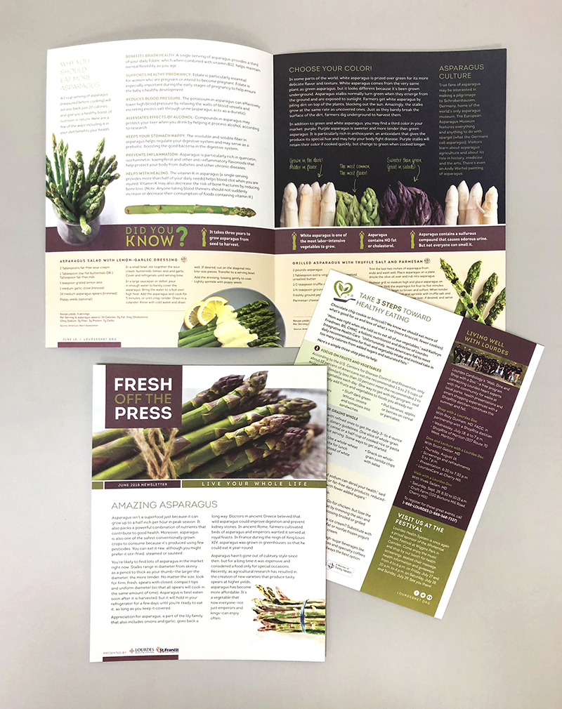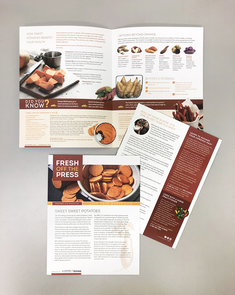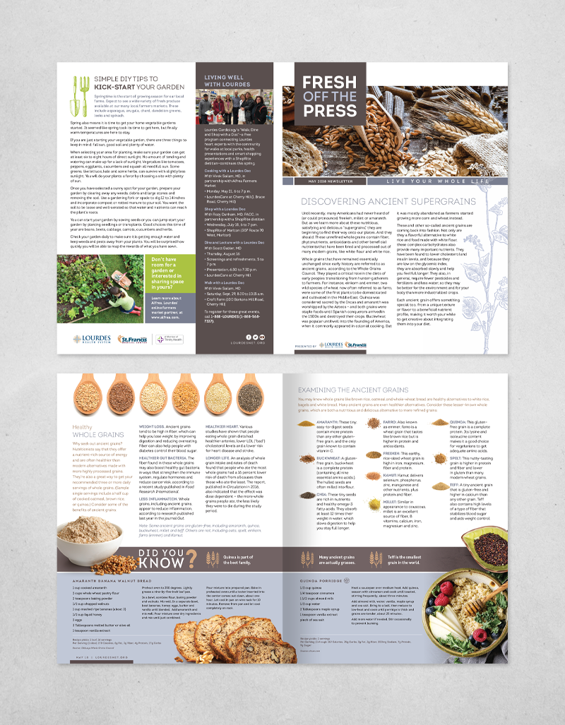 Provided the creative direction and design for monthly “Super Food” newsletters for Lourde’s Health System. Photography was taken as needed. The newsletters were created, written, designed and printed at The Kiva Group. Menu header templates and email blasts were also included.