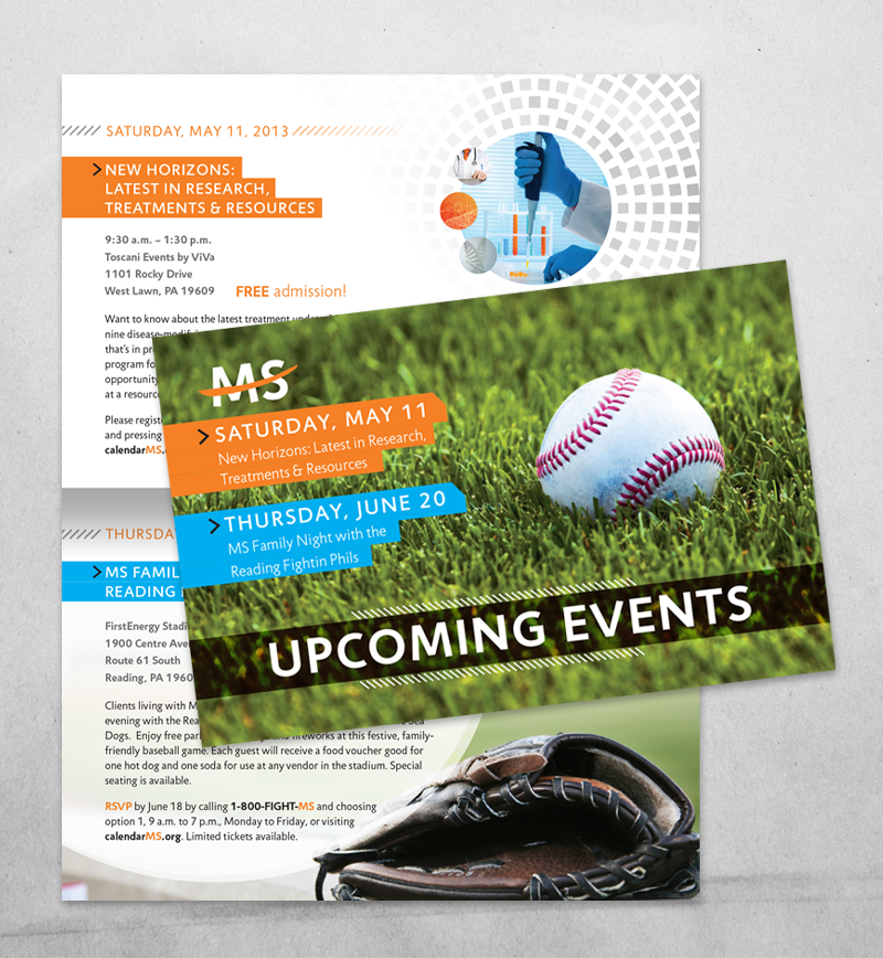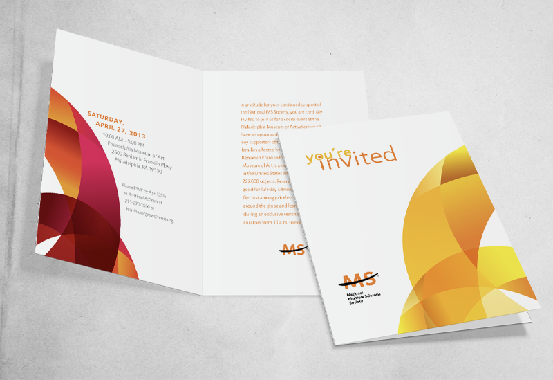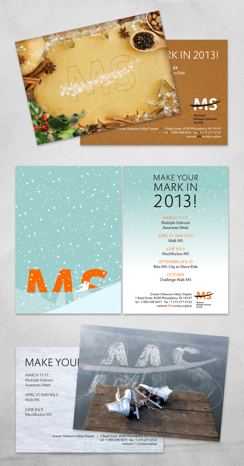 The Kiva Group has worked with the Philadelphia chapter of the MS Society for many years. They asked for holiday card designs incorporating their logo. Keeping with their branding guidelines I came up with some fun options for them. They eventually used all of them and their corporate office requested them as well. I also designed postcards and invitations for them.